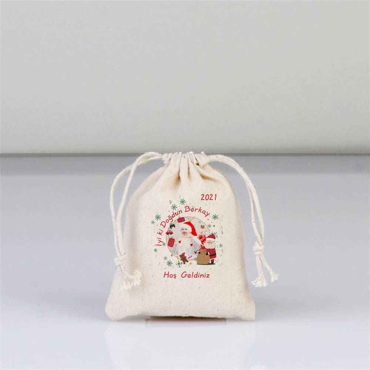 Kişiye özel yılbaşı kese üzerine baskı İçerisinde Elyaf ve lavanta bulunmaktadır.